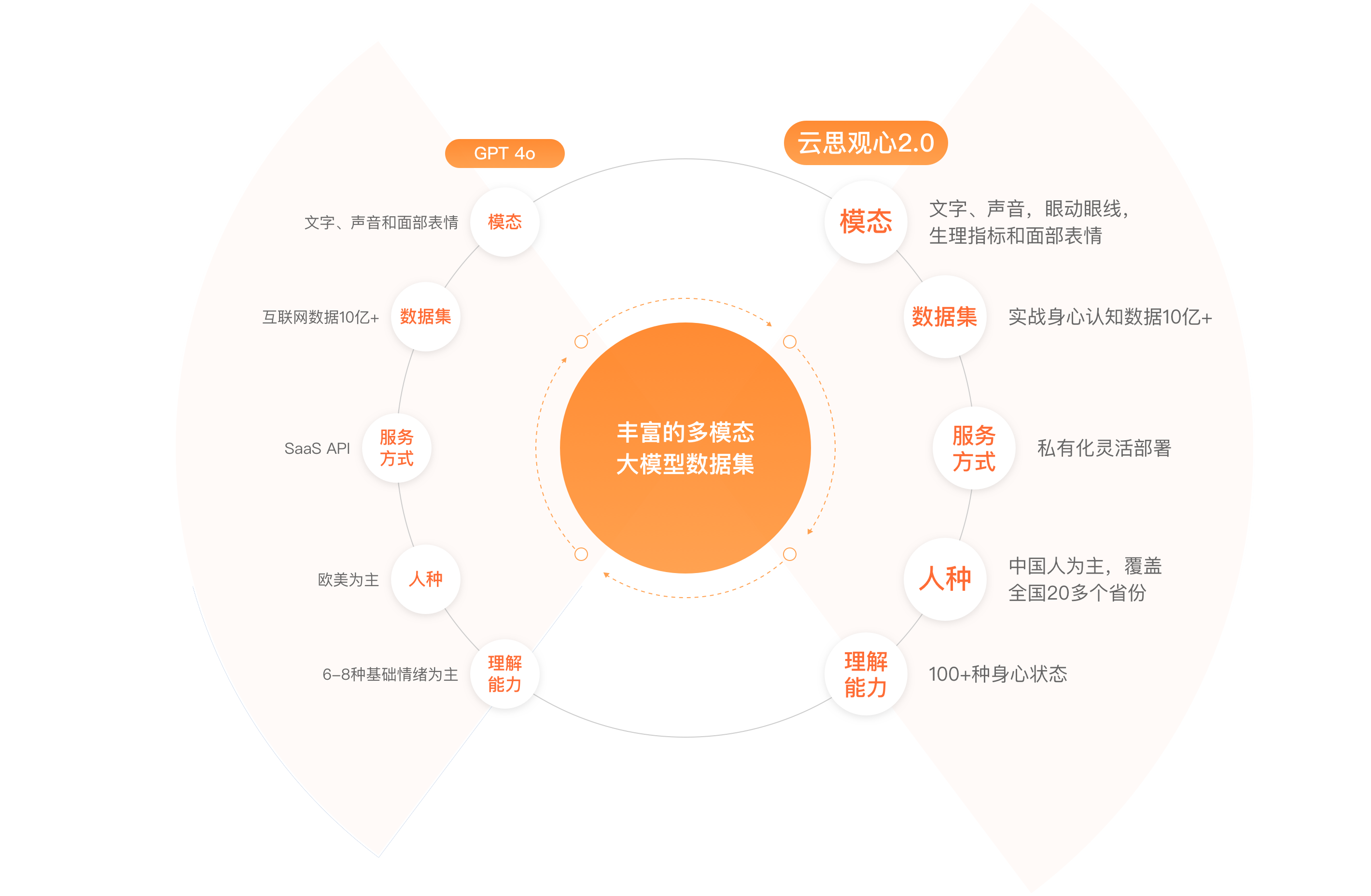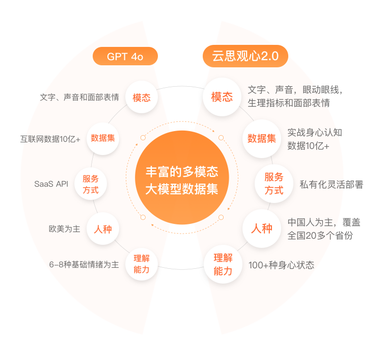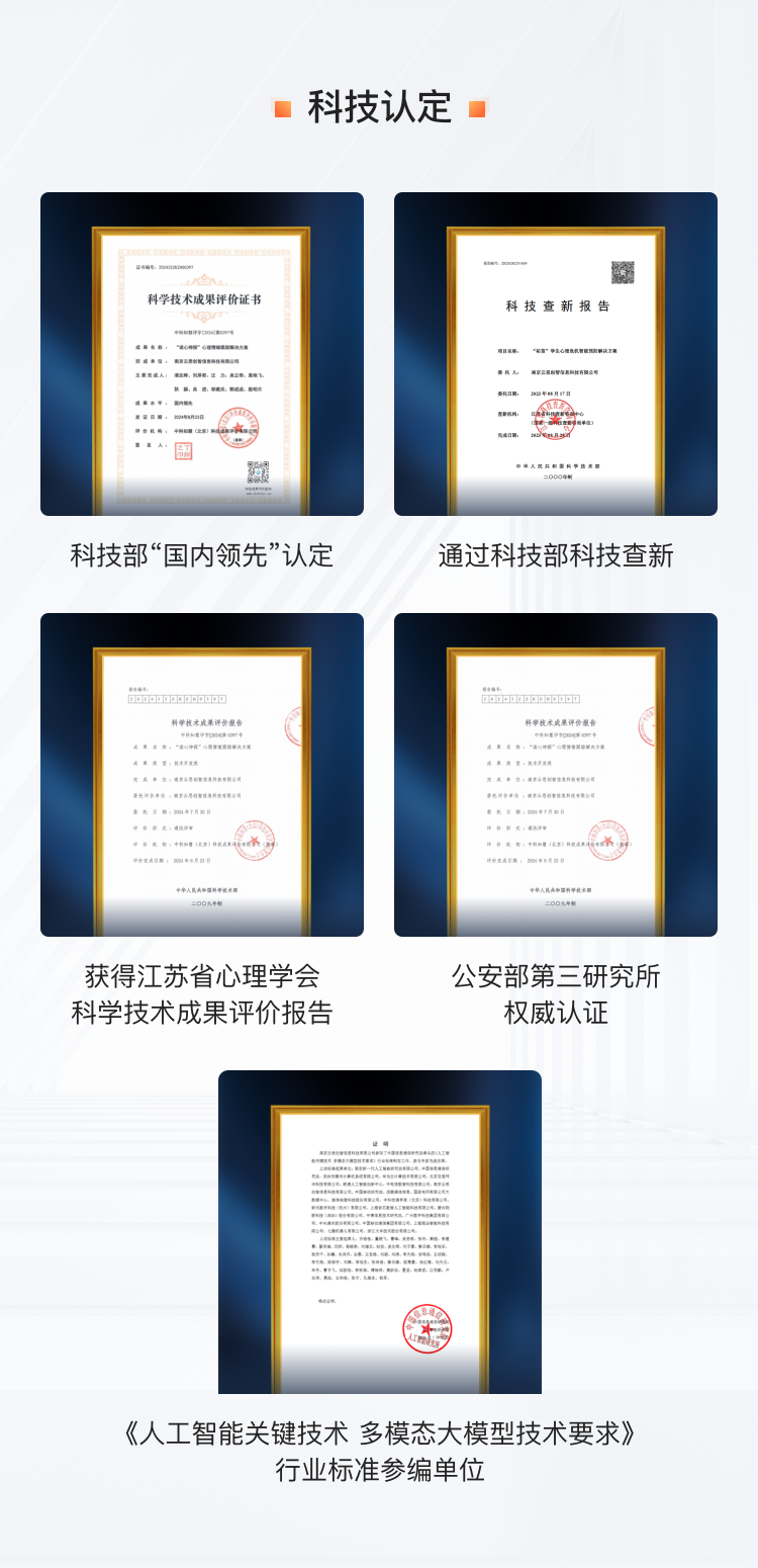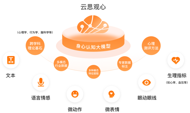 云思观心多模态身心认知大模型是云思创智历时5年自主构建研发,已获国家网信办算法备案 (网信算备320105247879901240019号) ,模型利用先进的多模态大模型融合技术,通过远程非接触无感知的方式采集并分析人的身心状态外化特征,包括微表情、肌肉震颤、生理指标(心率、血压)、语音语调、眼动眼线等。结合基于Transformer和动态置信度的多模态融合框架进行跨模态语义映射,精准感知环境变化与人的身心活动,增强机器对人身心状态的理解能力,让每一个机器人都成为有独特个性的智能体终端,最终实现生命级人机互动新范式,引领具身智能2.0时代。