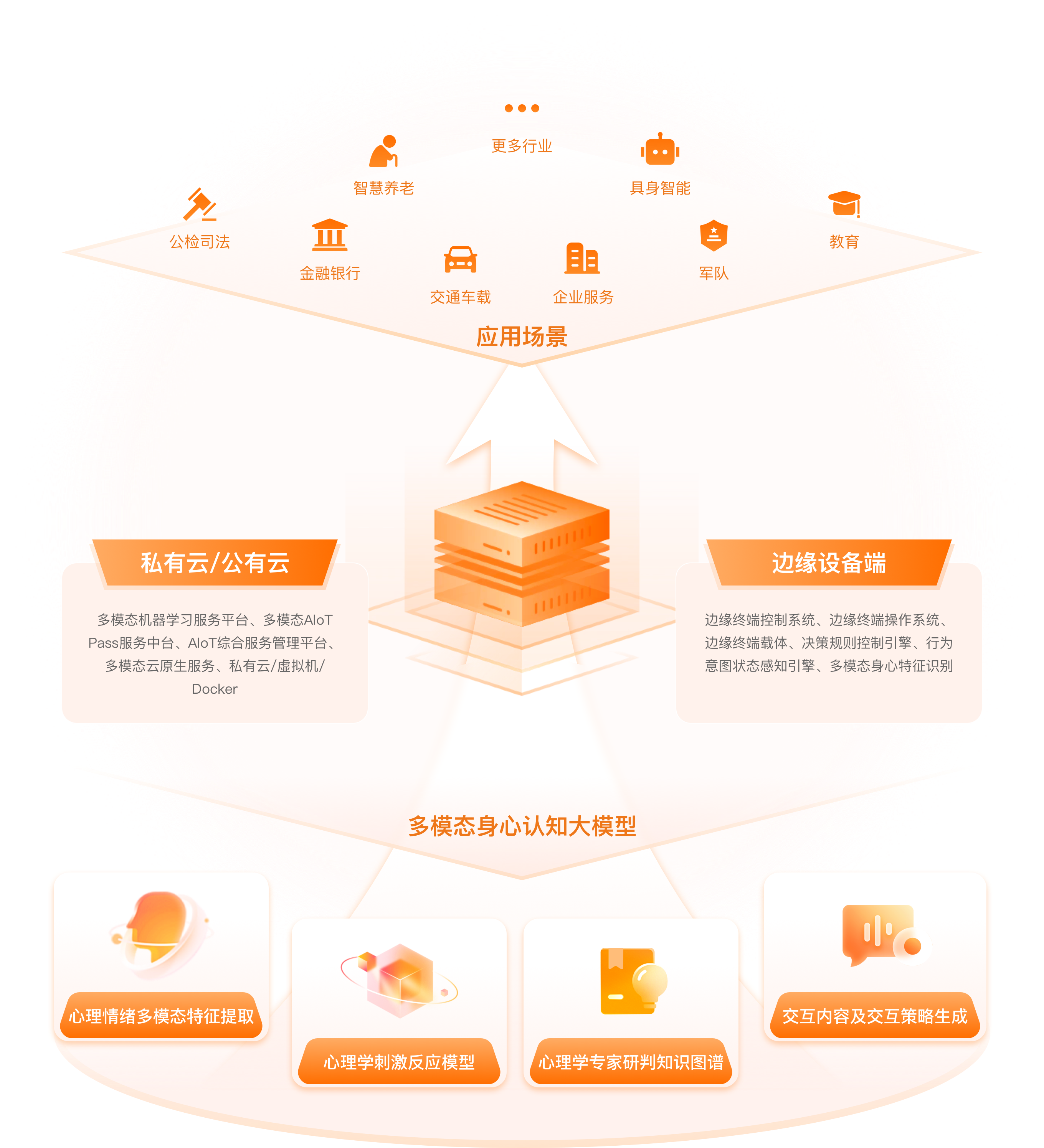 依托大模型的强大能力,我们构建了多模态身心认知大模型全场景智能体平台底座,为政法、教育、企业服务、具身智能等多个行业提供高效、智能的解决方案,全面赋能千行百业加速迈向智能化未来。