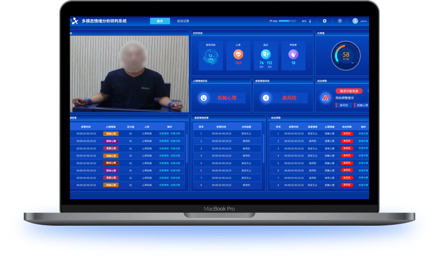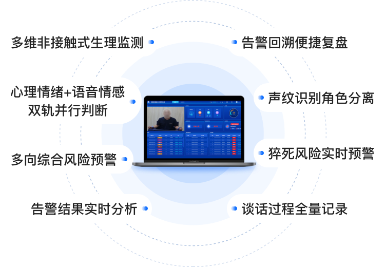 察觉风险实时预警:基于多参数融合算法,动态评估谈话对象健康风险,实时告警濒死风险。